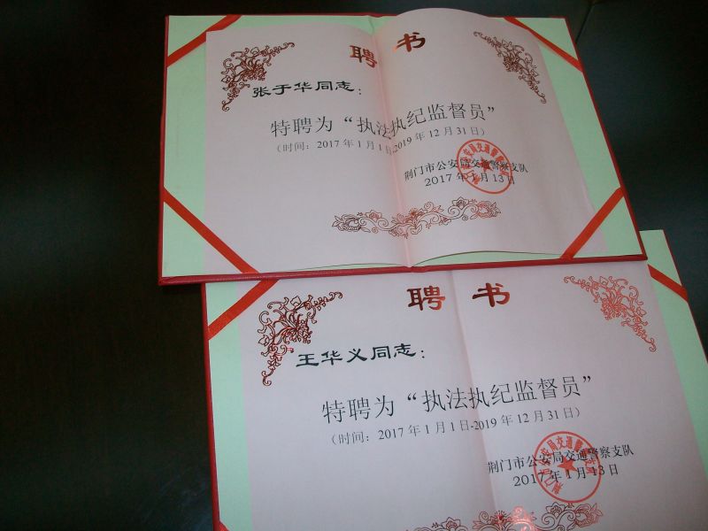 交警在對(duì)他們進(jìn)行獎(jiǎng)勵(lì)外,并給他們頒發(fā)了荊門(mén)交警支隊(duì)執(zhí)法執(zhí)紀(jì)監(jiān)督員聘書(shū)。