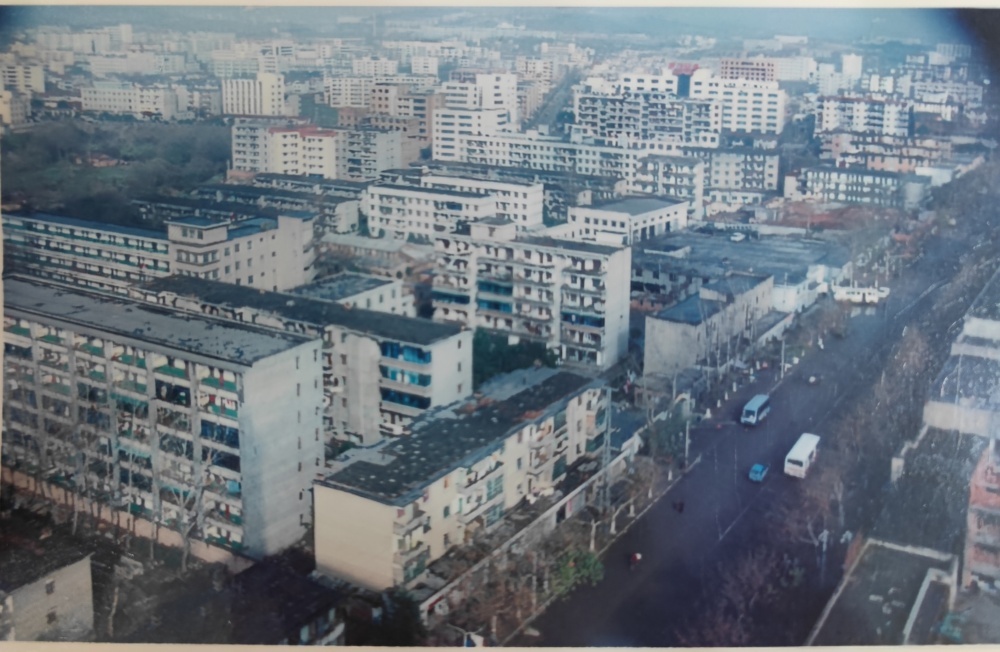 ▲80年代末,荊門市長(zhǎng)寧大道街景圖。荊門公交集團(tuán)總公司(舊址)位于長(zhǎng)寧大道西側(cè)。當(dāng)年總公司院內(nèi)建有辦公樓、停車場(chǎng)、機(jī)修車間、機(jī)加車間、油庫(kù)、倉(cāng)庫(kù)。