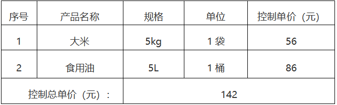 預(yù)算金額:本次詢價對大米、食用油的單價、合計總單價進(jìn)行詢價,在各分類報價不超過控制單價(含稅)的前提下,控制總單價142元,超過此采購預(yù)算的報價無效。